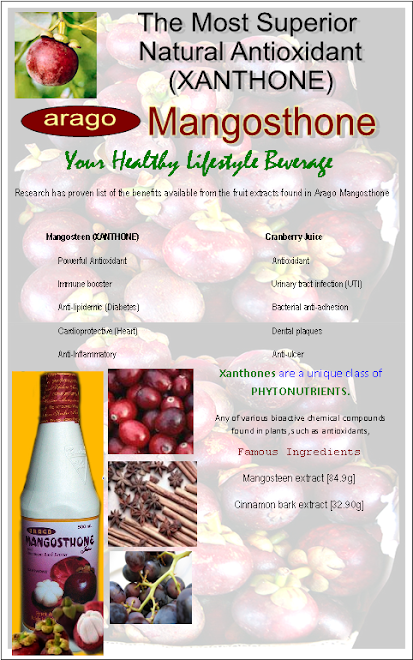Arago Mangosthone is not just your ordinary fruit beverage. It is completely revolutionary. The Mangosteen fruit (garcina mangostana) the "Queen of All Fruits" makes Arago Mangosthone so special, having numerous amazing nutritional qualities, for this fruit lies in its abundance of antioxidants called XANTHONE. Arago Mangosthone contains not just the extracts of the amazing fruit but it has more fruit extracts with documented pharmacological benefits, such as cinnamon bark extract, grape juice, cranberry juice and many more that makes Arago Mangosthone so different and unique from other Mangosteen beverage available in the country.